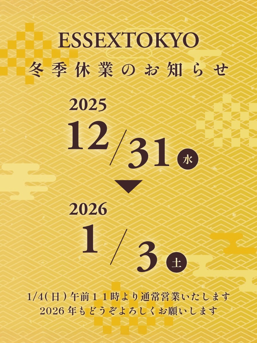 本年も ESSEXTOKYO をご愛顧いただき、 誠にありがとうございました。 数ある中から当店をお選びいただき、 皆様とのご縁に心より感謝申し上げます。 誠に勝手ながら、 12月31日・1月1日・1月2日は年末年始休業... [続きを見る]